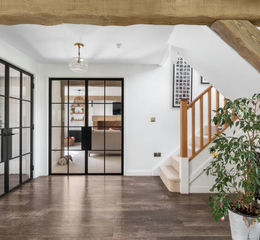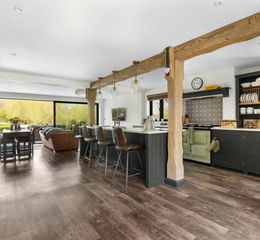 From the moment you arrive, the sense of space and quality is undeniable. A welcoming reception hall leads through glazed doors into the heart of the home — an impressive open-plan kitchen, dining, and living space designed for both everyday living and stylish entertaining. The bespoke handmade kitchen features an Aga, central island with breakfast bar, contrasting hand-painted cabinetry, and elegant quartz work surfaces. Flooded with natural light, the seating area opens seamlessly via sliding doors onto a terrace overlooking the river — the perfect setting for alfresco dining and relaxation.