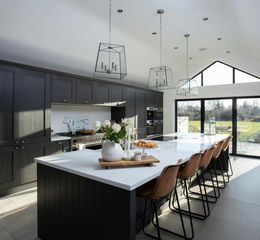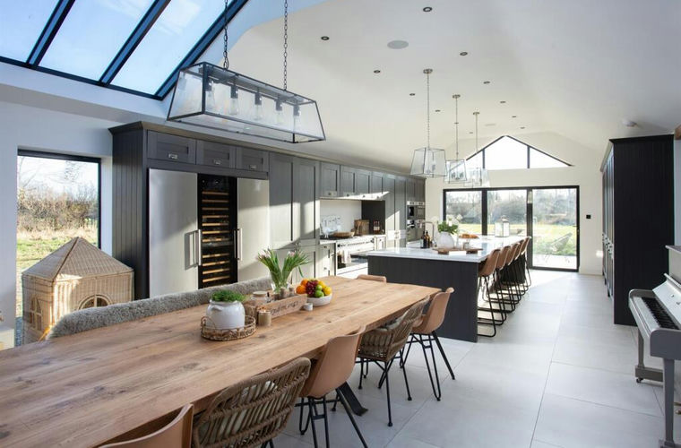 Find Out A Little More... - The entrance porch opens to the central staircase hall, illuminated at its far end by a contemporary floor-to-ceiling window. In this original part of the house lies the 24 ft sitting room, part-panelled, which includes a full-height window facing south across the garden, engineered oak floorboards of herringbone design, tall column radiators and a fireplace housing a woodburning stove flanked by a stylish recessed wood store. At the other side of the hall is the TV room/snug also with elegant wood panelling. The recent extension features the kitchen/dining/living room which is double height and extends some 50 ft with bespoke skylights and bifold doors opening south onto the garden terrace. The kitchen itself has a concealed walk-in pantry, silestone work surfaces, a large island unit with family-sized breakfast bar, a 2-in-1 tap with filtered cold water and boiling water, and both Bosch and Neff integrated appliances including a microwave oven, larder fridge and freezer, wine fridge and coffee machine. Alongside is a utility/laundry room and 4-piece bathroom with freestanding bath tub. This entire area has been fitted with underfloor heating. The playroom has storage options and French doors that open south onto the terrace and children’s play area.