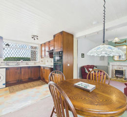 Range of wall and base units with contrasting work surfaces and tiled splashbacks. Stainless steel sink and drainer with a swan neck mixer tap. Inset double electric oven and a four ring hob with an extraction canopy over. Plumbing for a washing machine and space for a tall fridge freezer. Finished with a dining area.