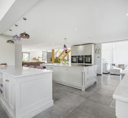 From the moment you step inside, the home's thoughtful design and meticulous craftsmanship are evident. The impressive open-plan layout seamlessly integrates living, dining, and kitchen spaces, ideal for both vibrant gatherings and tranquil family evenings. At its heart lies a bespoke, handcrafted Murray Design kitchen, boasting two generous breakfast islands, extensive larder cupboards, and integrated workstations, exuding contemporary elegance and practicality. Adjacent dining areas comfortably seat up to 20 guests, highlighting the home's fantastic entertaining potential.