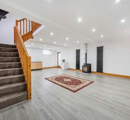 Open Plan Lounge / Kitchen / Dining Room - Four high level double glazed windows, double glazed exterior door to side, recessed spot lighting, two radiators, vinyl wood effect floor covering, feature cast iron log burner, oil fired central heating boiler, central heating control, TV and telephone points, range of fitted wall and floor units, work surfaces, space for appliances, integrated ELECTRIC OVEN, FOUR-RING HOB, COOKER HOOD over, stainless steel sink and drainer, tiled surround, stairs leading off to first floor and two smoke detectors.