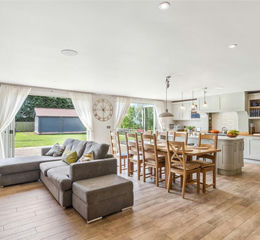 The ground floor accommodation has been thoughtfully designed to combine everyday comfort with elegant entertaining. At its heart lies a beautifully appointed kitchen and dining room, featuring classic Shaker-style cabinetry and a walk-in pantry cupboard. Adjoining this is a characterful family room, part of the original property, showcasing exposed beams and a woodburning stove, creating a warm and inviting atmosphere.