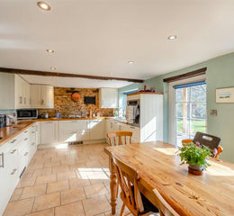 Kitchen/Breakfast Room - 7.06m x 3.38m (23'02 x 11'01) - Farmhouse kitchen comprising of a range of base and wall mounted units with wooden worktops and splashbacks, exposed Gorsley stone feature wall, exposed beamwork, tiled flooring, Everhot range oven, integrated appliances to include fridge / freezer, wine fridge, dishwasher, oven, five ring induction hob, kick heater, TV and telephone point, inset spotlighting, two rear aspect windows and a glazed door leading to patio and gardens offering lovely views. Thumb latch door to: