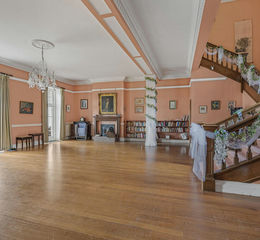 The principal reception room is of particular note: an impressive wood-panelled space with a striking double split staircase rising to the first-floor galleried landing. Three pairs of French doors open onto a covered veranda, creating a seamless relationship between the interior and gardens. A study lies adjacent, and the basement provides two useful ancillary areas.