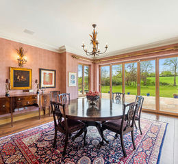 The heart of the home is an impressive open-plan kitchen/dining/family room. The country-style kitchen features granite worktops and a premium LaCanche oven, complemented by two integrated freezers and three integrated fridges. A log fire and wall-mounted television enhance the family space, which showcases extensive exposed brickwork and opens seamlessly to a garden room with direct access to the beautiful grounds. Expansive bi-fold doors frame glorious south-westerly views across the gardens and fields beyond. The adjoining living area is equally elegant, boasting oak flooring, oak architraves, oak doors, decorative cornicing, an open fire, integrated ceiling speakers, and LED spotlighting. The ground floor further includes a formal reception room, a distinguished dining room, a private study, and two well-appointed utility rooms. Rooms on the ground floor level benefit from floor-to-ceiling windows or French doors, flooding the interiors with natural light and offering effortless connection to the magnificent gardens.