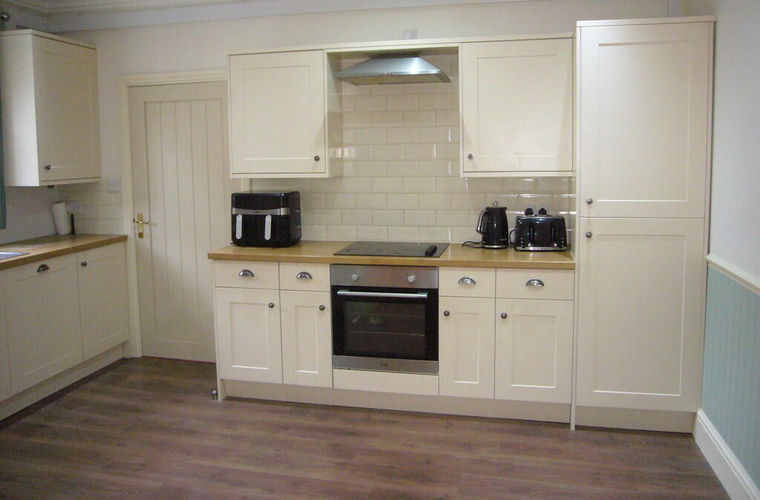 DINING KITCHEN 15' 6" x 14' 0" (4.72m x 4.27m) Range of shaker style units comprising sink unit, base units with worktops and wall cupboards. Built in oven and ceramic hob with extractor over. Integrated fridge, freezer and dishwasher. Island unit with oak worktop. Radiator, downlighters and part ceramic tiled walls.
