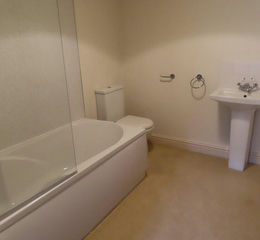 ENSUITE SHOWER ROOM White suite comprising panelled in bath, pedestal washbasin with tiled splashback and low flush WC. Shower overbath with side screen. Radiator.