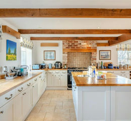 Kitchen / Dining Room - 7.72m x 6.76m (25'4 x 22'2) - Exposed oak timbers, wide range of base units, Belfast sink, central island with separate sink, cupboards and drawers, duo hanging baskets, range cooker with 5 ring gas hob and electric ovens, built-in cooker hood above, integrated fridge, freezer and dishwasher, tiled flooring, radiators, large walk-in pantry with shelving. Front, side and rear aspect windows with lovely private outlook from all aspects. UPVC double glazed patio doors leading out to the parking area.